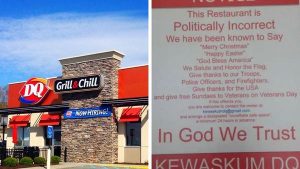 A Dairy Queen restaurant in Kewaskum, Wisconsin is causing quite a stir on the internet with the message displayed on its front window. The sign proudly declares the restaurant’s “political incorrectness,” highlighting its use of holiday greetings like “Merry Christmas,” “Happy Easter,” and “God Bless America.” Additionally, the sign shows appreciation for veterans, offering them complimentary sundaes and expressing gratitude for their service.