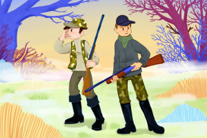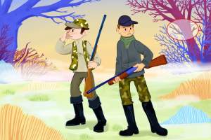 These two hunters have been on the hunt for a deer. They caught a glimpse of it before it sprinted away and disappeared once again. The hunters chased after it. They know it is nearby, but they cannot spot it. Can you find the deer?