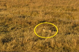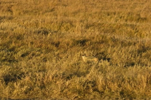 Here, we have a scene from a rather grassy area. However, the grass is tall and the light from the sun seems to be the same hue as the grass. Believe it or not, there is a cat-like animal hiding in plain sight here. Can you spot it?