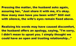 The story goes like this: a newlywed couple is lying in bed, and the husband musters up the courage to ask his wife how many men she has been with before him. However, instead of answering, the wife remains silent, gazing up at the ceiling. The husband tries again, assuring her that he wants to foster openness and trust in their relationship. Still, all he is met with is her silence, which leaves him feeling remorseful and worried about having upset her. To console her, he