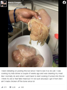 Explaining pasta was not on the menu that night, the mom shared a social media post that shows the raw chicken she was washing, coming apart in her hands.