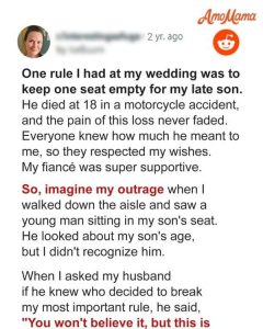 The ceremony was filled with love and happiness, but during the reception, as Jennifer mingled with the guests, she couldn’t help but notice an unfamiliar man occupying the seat meant for Rowley. Her anger flared up – who dared to disrespect her son’s memory? Determined to confront the intruder, she marched over to the seat.