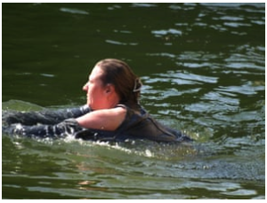 The 32-year-old woman is now recovering in the hospital following surgery to repair her wounds.