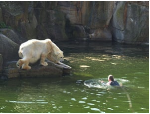 A polar bear assaulted a 32-year-old lady on Friday after she jumped into their cage at the Berlin Zoo when they were being fed.