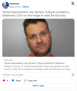 On October 25, former “Home Improvement” star Zachery Ty Bryan made headlines when he was arrested in Custer County, Oklahoma. The arrest came after Bryan was suspected of driving under the influence for a second felony offense and driving without a valid driver’s license, according to Oklahoma police