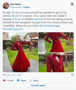 After a viral post made by his mom Nina Green, that shows her teenaged son primed and primped for prom, fervent disciples of the woke movement praised his flowing frock while others played the shame game, saying it demonstrates the “failure” of a parent “in encouraging this sort of thing.”