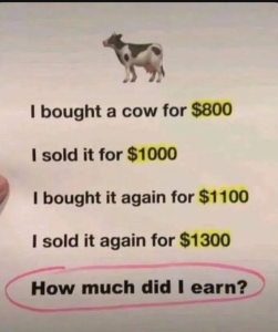 Finally, you sell the cow again for $1300, making a profit of $400 ($1300 – $900).