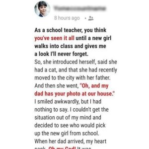 When a student sees her teacher for the first time, she shouts, “My dad has a picture of you!”