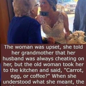 Grandmother shares a piece of wisdom using a carrot, eggs and coffee